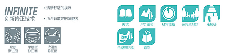 Nikon INFINITE系列产品之一的Presio Advance渐进多焦点镜片,在平缓型修正面基础上,通过高密度的优化点,优化球光和散光,拓宽看远视野。使视野清晰舒适。