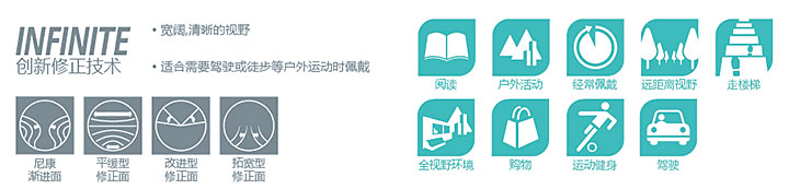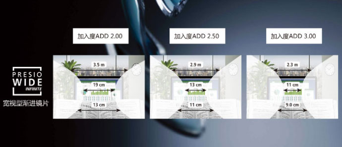 Nikon INFINITE系列产品之一的Presio Wide渐进多焦点镜片,在原有的平缓型修正面与改进型修正面基础上,将视远区变宽12%,提供更广阔的视野。
